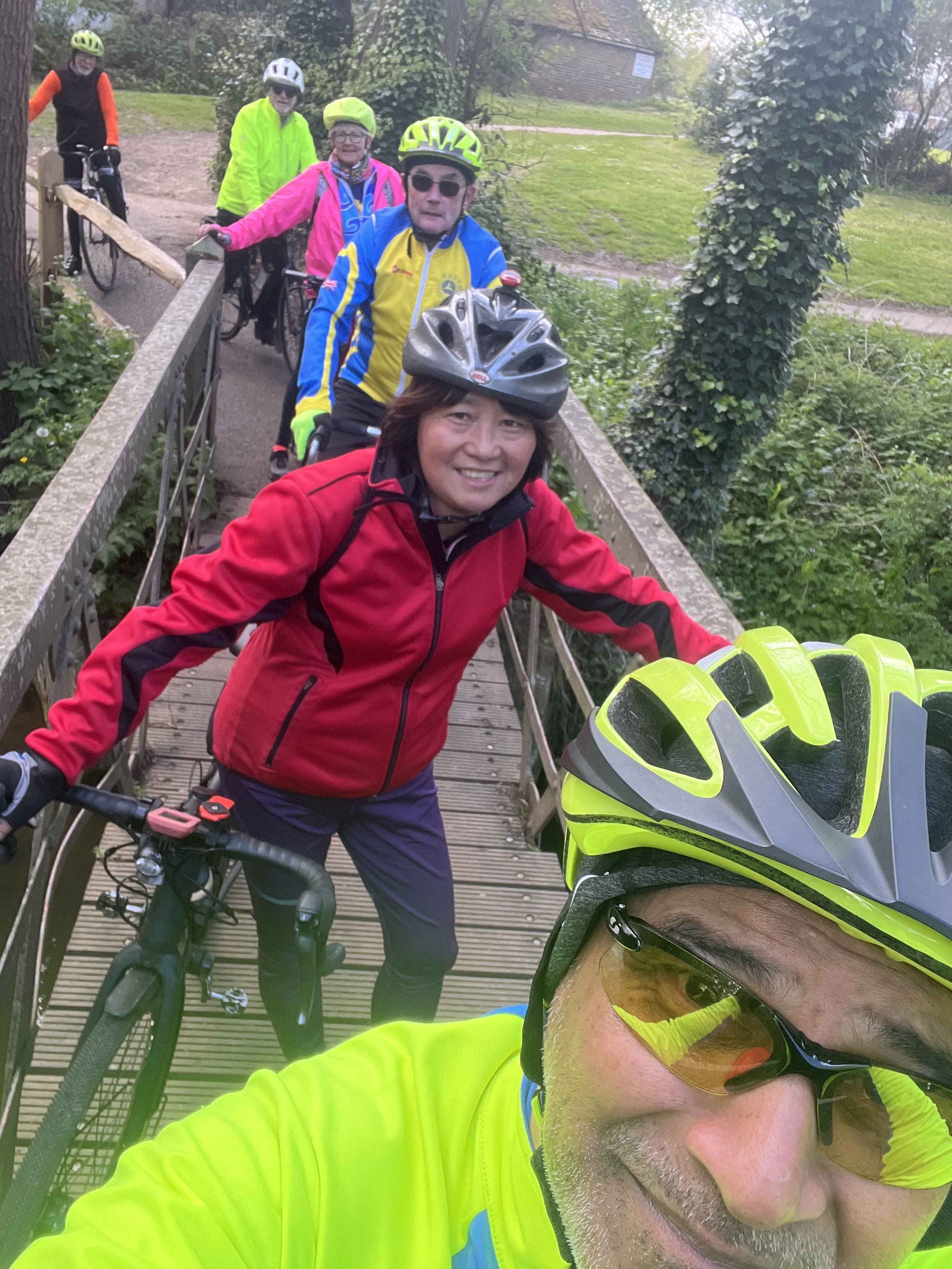 Elevenses at Tanhouse Farm meant long rides by most just getting there. Suitably rested and fed, my first group of 6 riders (Mick, Christina, Dave, Linda, Geoff (back-marker)), set off on time for a reasonably quick paced ride south towards Warnham and the quiet lanes of Broadbridge Heath for a hydration break and a group photo opportunity. By now, the sun was shining bringing some warmth as last, so happy days!
